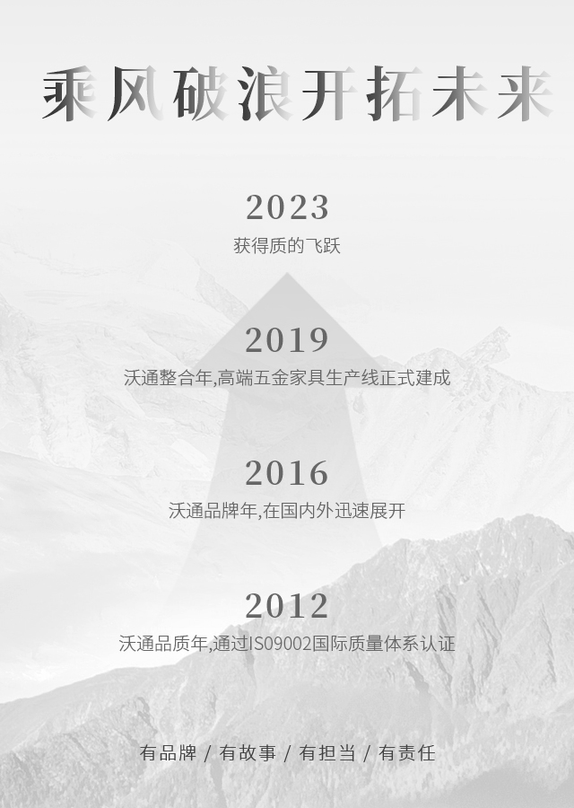 沃通五金將積極弘揚中國家具文化,綜合國際家具潮流,運用無限的創意,設計生產出大量造型美觀,引領時代潮流的新產品。